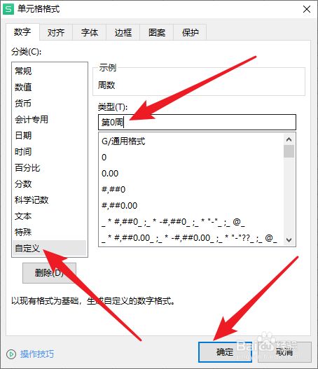 16.选择“自定义”,格式输入“第0周”,点击确定;