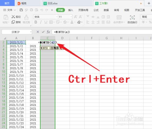 8.同理计算”月“列,输入公式:=MONTH(A2),按”Ctrl+Enter“,填充所有已选的单元格;