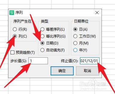 3.在序列里依次按照图示点击:列、日期、日,步长值1,终止值2021/12/31;