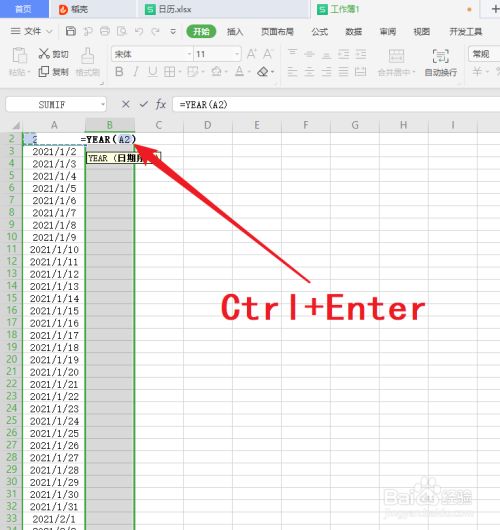 7.输入公式:=YEAR(A2),按”Ctrl+Enter“,填充所有已选的单元格;