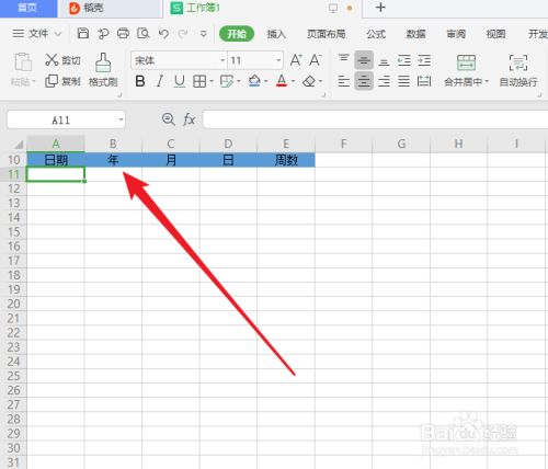 1.打开WPS表格,先设置表头,表头包含的标题有:日期、年、月、日、星期、周数;