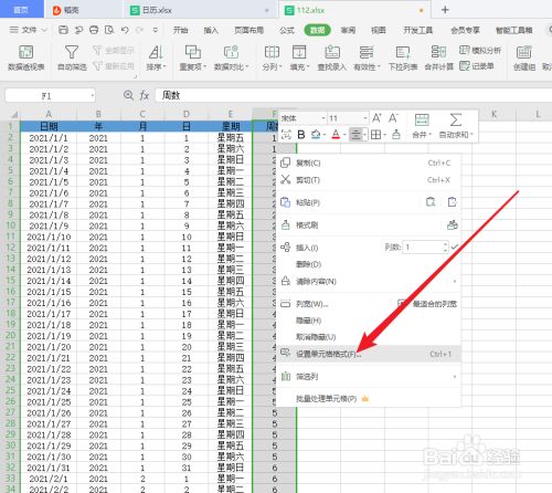15.选择周数列,右键单击,选择设置单元格格式;