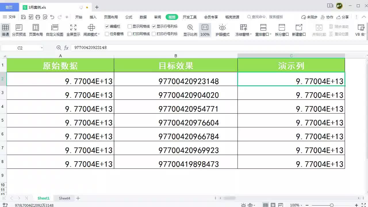 大家好,今天跟大家分享一个WPS表格办公技巧,有时候我们在表格中输入的数字比较长时会出现数字显示不正常,变成E+的样式,如下图所示,就像我们现在看到的A列中的数字这样。如果我们想快速让数字全部恢复正常,变成B列中的显示样式,应该怎么办呢?下面我们一起来看一下。