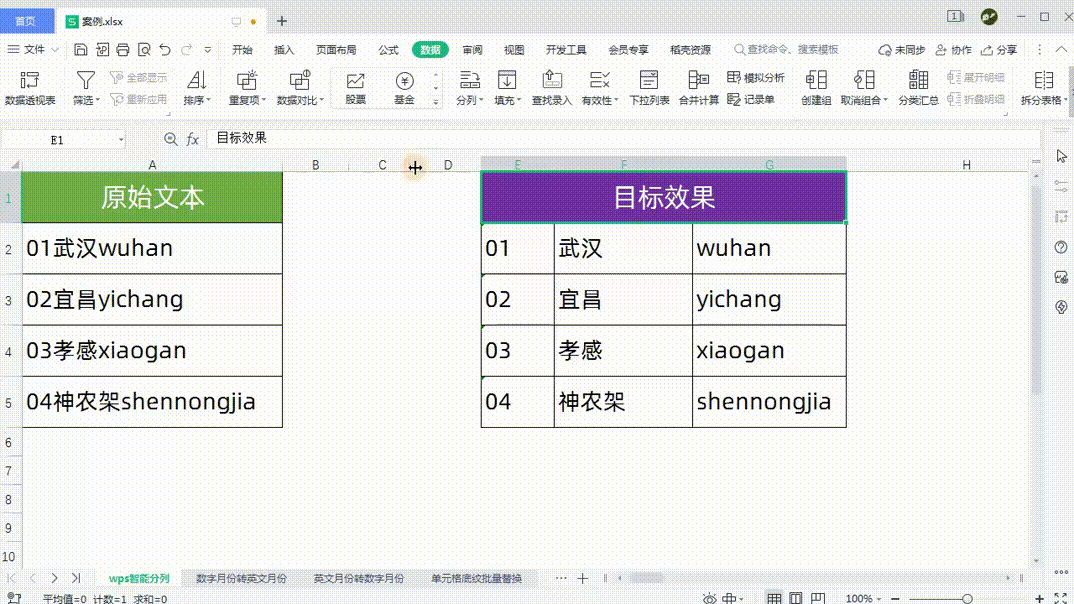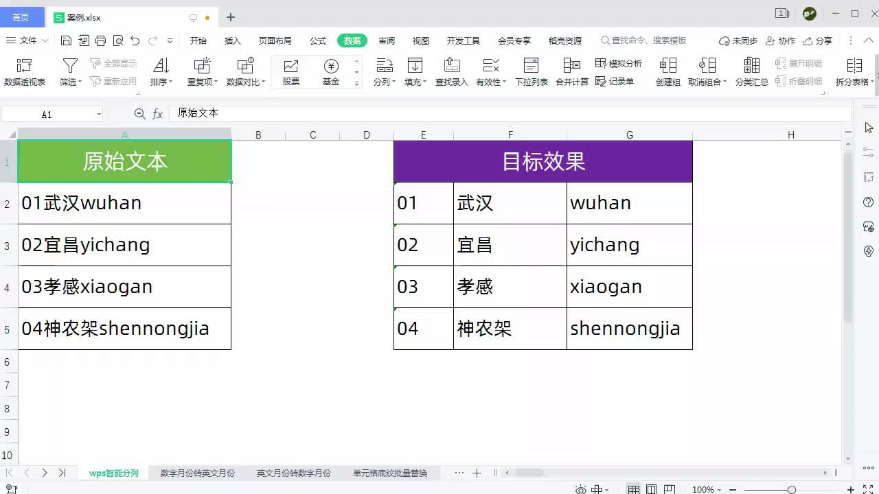 大家好,今天跟大家分享如何利用WPS的智能分列功能对工作表中的数据进行快速拆分。我们现在看到的工作表中左侧是原始文本,在同一列中同时显示了数字序号、中文城市名称、英文城市名称。我们想实现的目标效果是让数字单独成为一列,中文城市名称单独成为一列,英文城市名称单独成为一列。下面我们看看如何快速实现这样的效果。