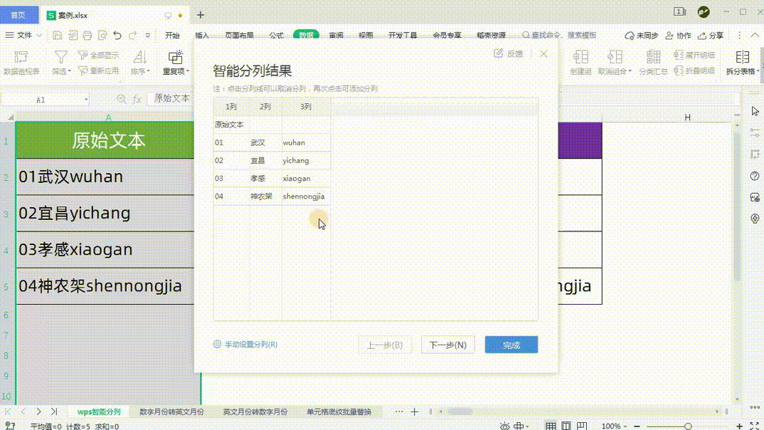 选中原始文本列。在数据选项卡下单击分列按钮右侧的倒三角,在弹出的列表中选择智能分列,接下来可以在智能分列结果对话框中预览分列结果。