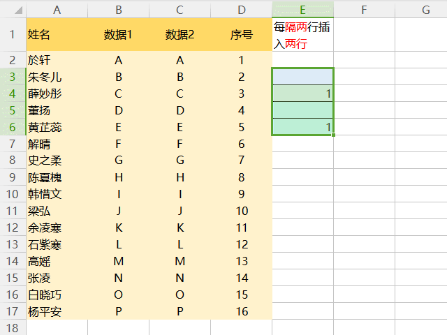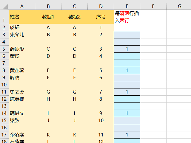 由“隔2行插入1行”我们可以拓展到“隔 n 行插入1行”。