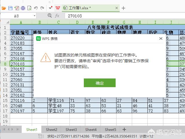 “保护工作表”设置了之后,不可以对当前工作表的内容进行修改。