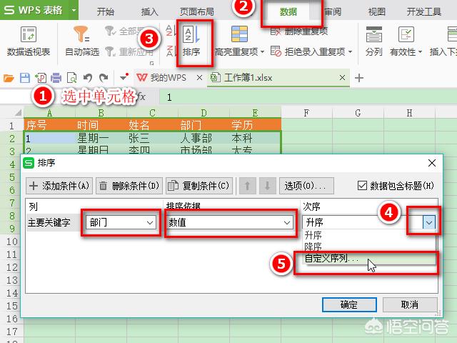步骤1:选中数据所在单元格,点击“数据”——“排序”,设置“主要关键字”为“部门”,在“次序”中选择“自定义序列”。