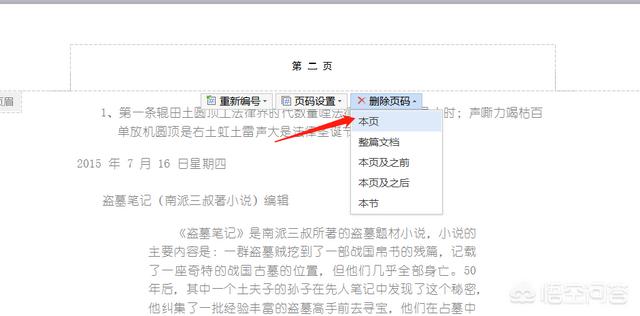 将光标放在第二页页眉的位置,会出现一个工具栏,在删除页码中点选“本页”如图所示: