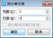 弹出“拆分单元格”对话框,设置“列数”与“行数”,例如我们将拆分的行数与列数都设为2,单击“确定”按钮即可。