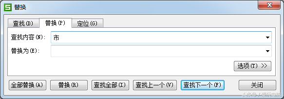 按Ctrl+F快捷键(在WPS中还可以按Ctrl+H快捷键),查找内容输入“市”,替换内容不管,点“全部替换”: