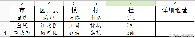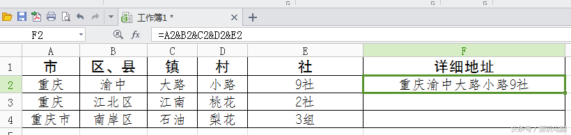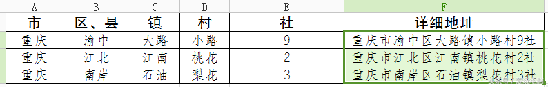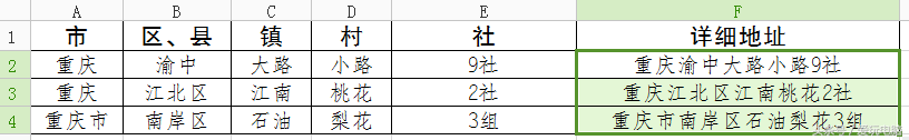 我们重新在F2列输入公式:=A2&”市”&B2&”区”&C2&”镇”&D2&”村”&E2&”社”,回车后,进行向下填充,就是如下效果: