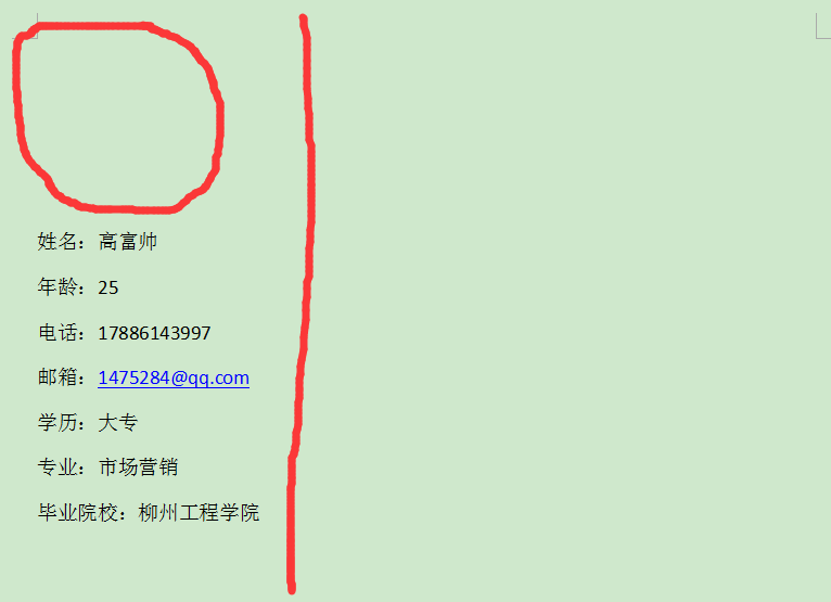 从左边开始,输入基本信息,包括姓名,年龄等,需要注意的是,不要从第一行输入,如下图,在画圆圈的地方,空出来,留着待会添加图片,右边空白处添加正文。