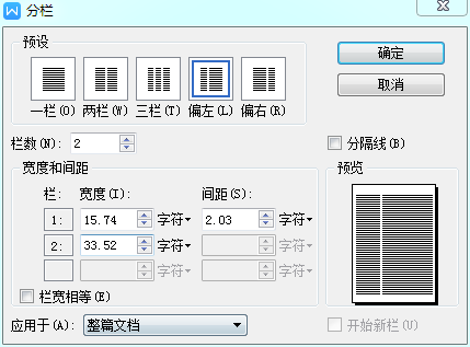 在页面布局里红色箭头处找到分栏这个图标,分栏可以有好多栏,根据个人喜好选中偏左或者偏右图标,点击确定就可以。这里以偏左为例;