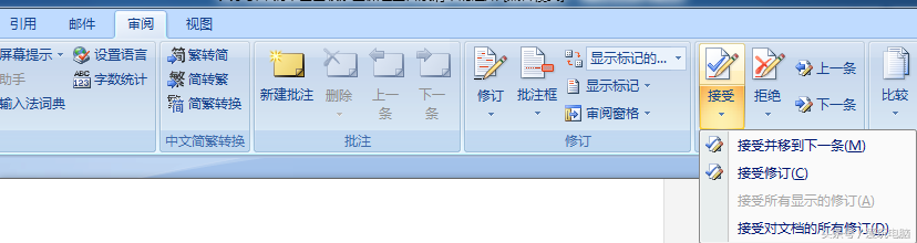 以上都是在WPS中的操作,在word2007中也是一样的,点击“审阅”/“接受”,并选择。如下图: