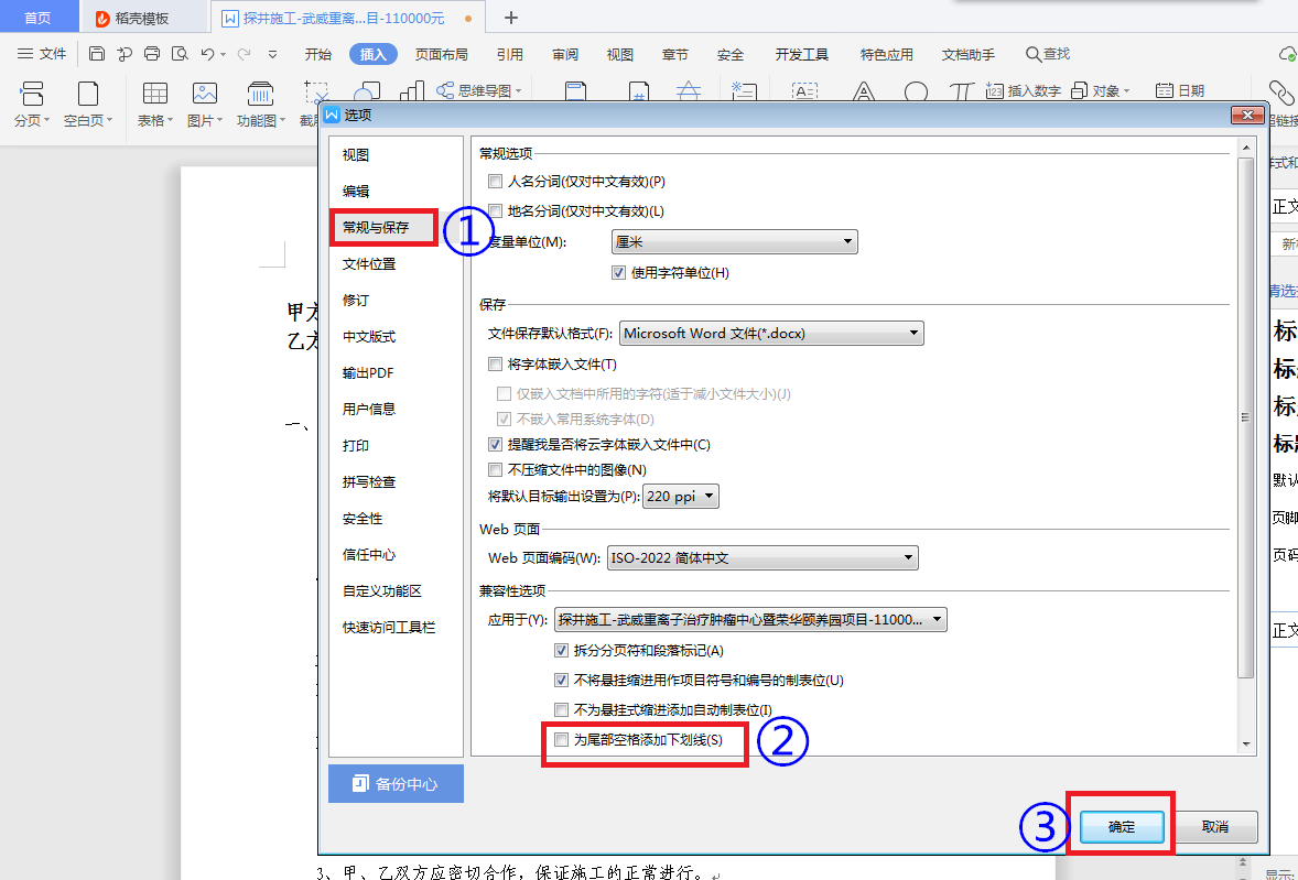 2.在弹出的对话框中选择第三项“常规与保存”,在右边的选项中,“为尾部空格添加下划线”前面的方框里打勾,点“确定”按钮。