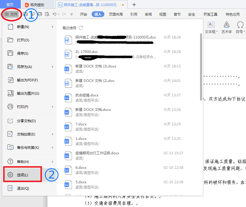 1.单击wps文档左上角“文件”选项,在弹出的下拉菜单中选择“选项”(倒数第二个选项,如图)