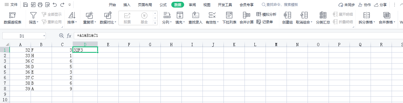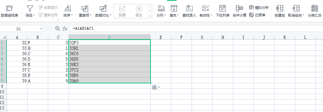 5、分列后的内容做完排序后,选中单元格D1,输入“=”再输入“A1&B1&C1”将分列的内容用“&”连接起来,按Enter键鼠标放在选框右下角,变成黑色“ ”时 向下拖动自动填充单元格内容。
