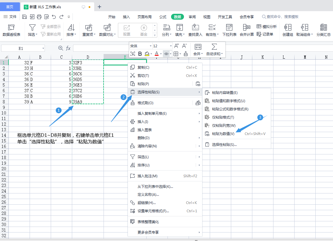 6、框选单元格D1~D8并复制,鼠标右键单击单元格E1,单击“选择性粘贴”,选择“粘贴为数值”。