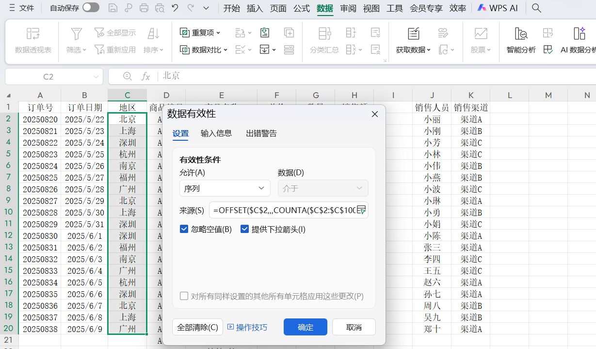 公式说明:通过COUNTA函数计算出$C$2:$C$1000区域内非空单元格的数量,结合OFFSET函数动态确定下拉菜单引用区域,实现下拉菜单内容自动更新。