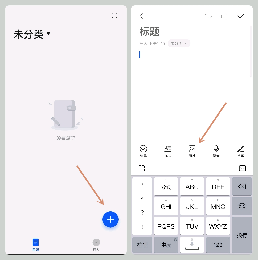 1.打开手机的备忘录,点击右下角的【+】创建一个新的备忘录,在下方的五个图标里面选择图片。