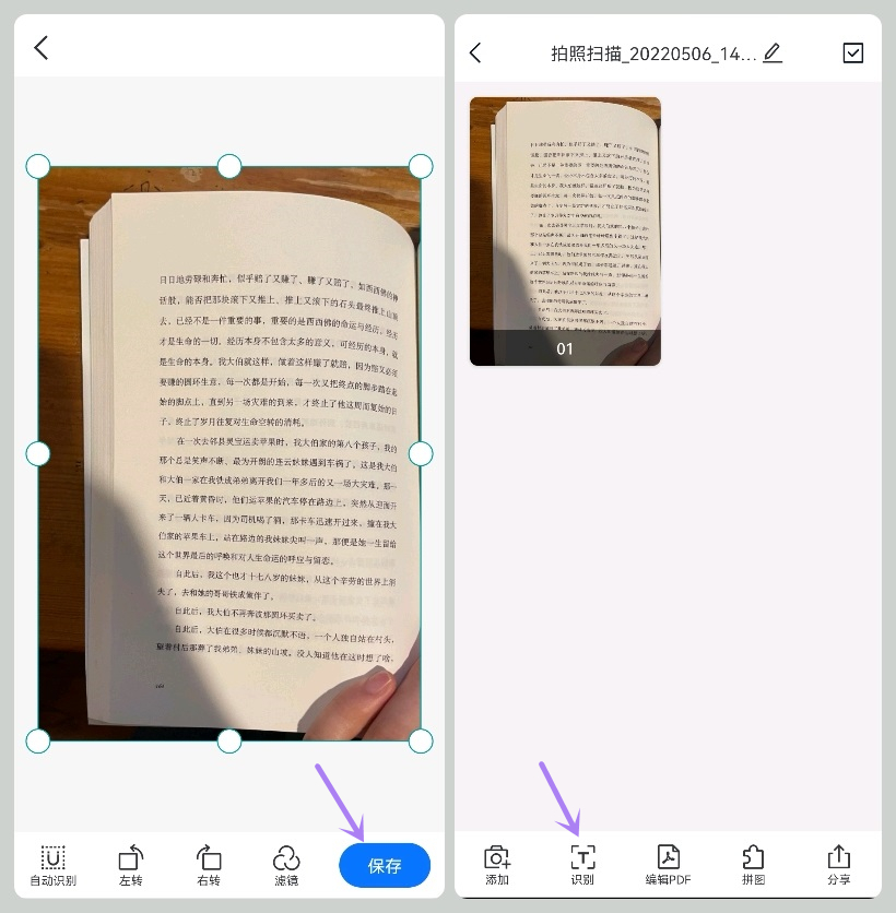 2. 拍摄上传图片之后,我们选择保存,然后在下方的选项栏选择【识别】功能。