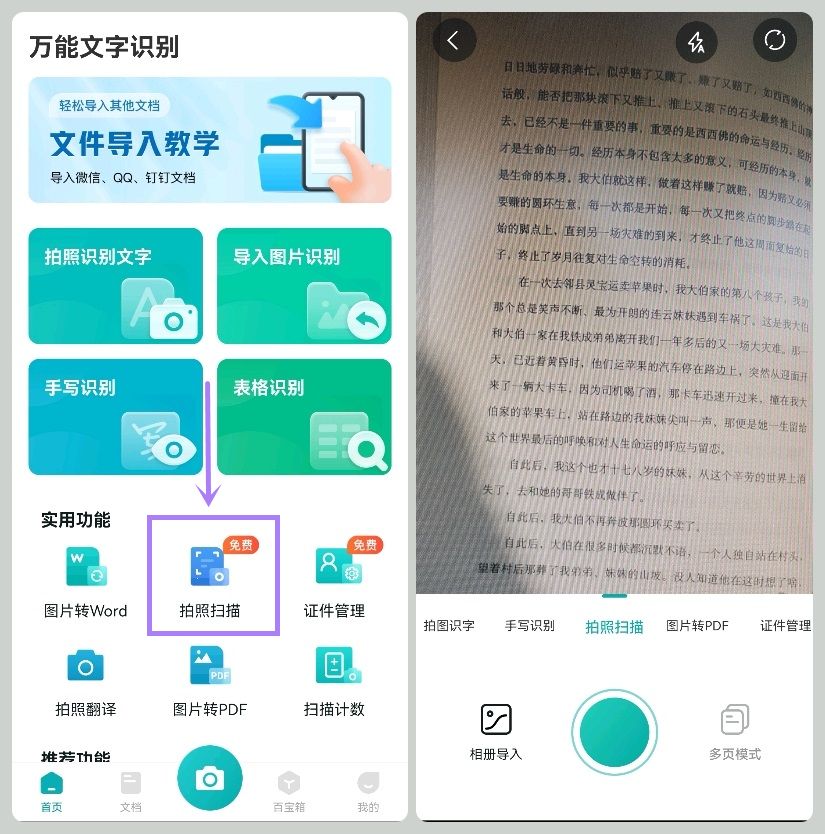 如果你的手机备忘录没有这个功能,你也可以使用【万能文字识别】这款工具。它支持免费的拍照扫描功能。