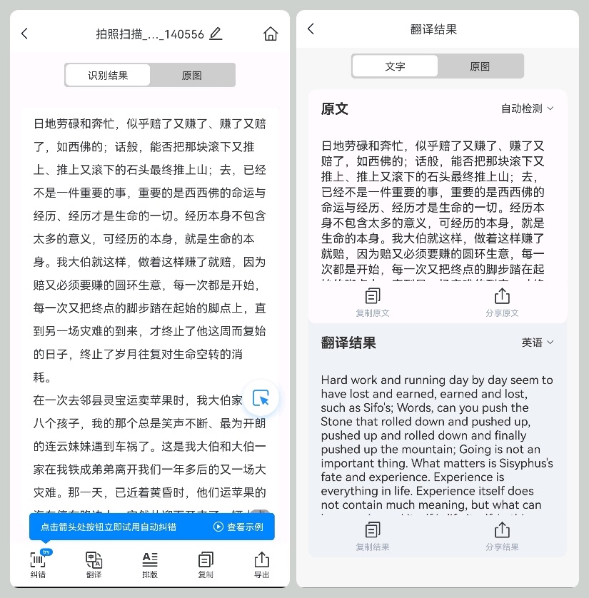 3. 可以看到内容都被识别出来了,我们可以随意编辑、复制、排版和智能纠错识别后的内容,还可以翻译内容,支持很多国家的语言,中文内容非常方便的就帮我翻译成英文了。