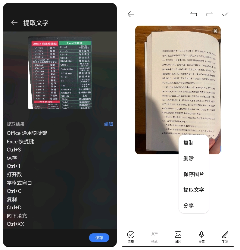 3. 提取文字之后文字内容就出来了,我们可以编辑识别内容和保存内容,当然啦,我们也可以直接上传拍摄好的图片,然后长按图片选择提取文字哦。