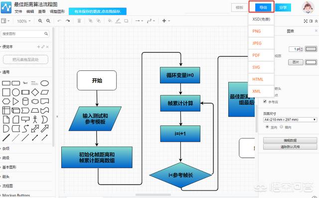 6.绘制成功的流程图可以导出进行储存使用,在编辑面板的右上方选择导出操作,之后选择导出格式就可以进行导出使用。