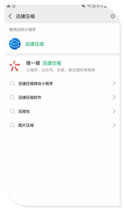 除了清理手机的里的垃圾,我们还可以给手机里的文件瘦身!我们打开微信,然后添加一个小程序——【迅捷压缩】