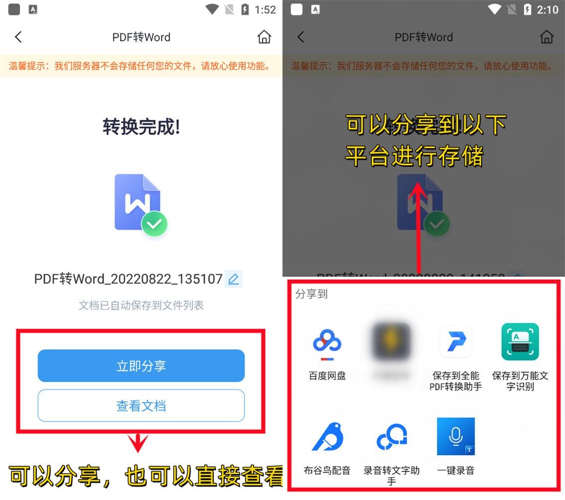 转换成功之后,可以分享在其它平台进行存储,也可以在app中直接进行查看。