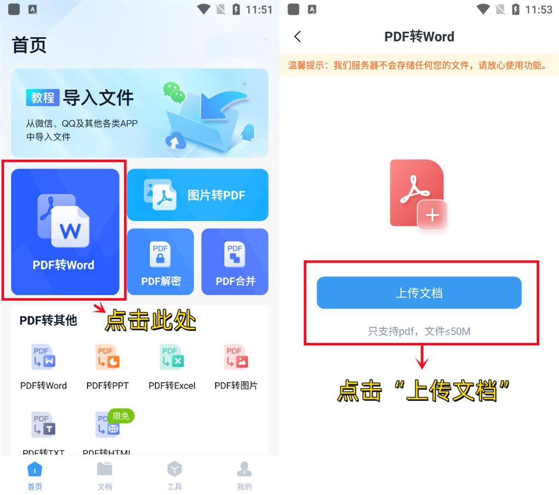 首先,在手机中打开app,在界面选择【PDF转Word】功能,接着通过【上传文档】导入需要转换的PDF文件;