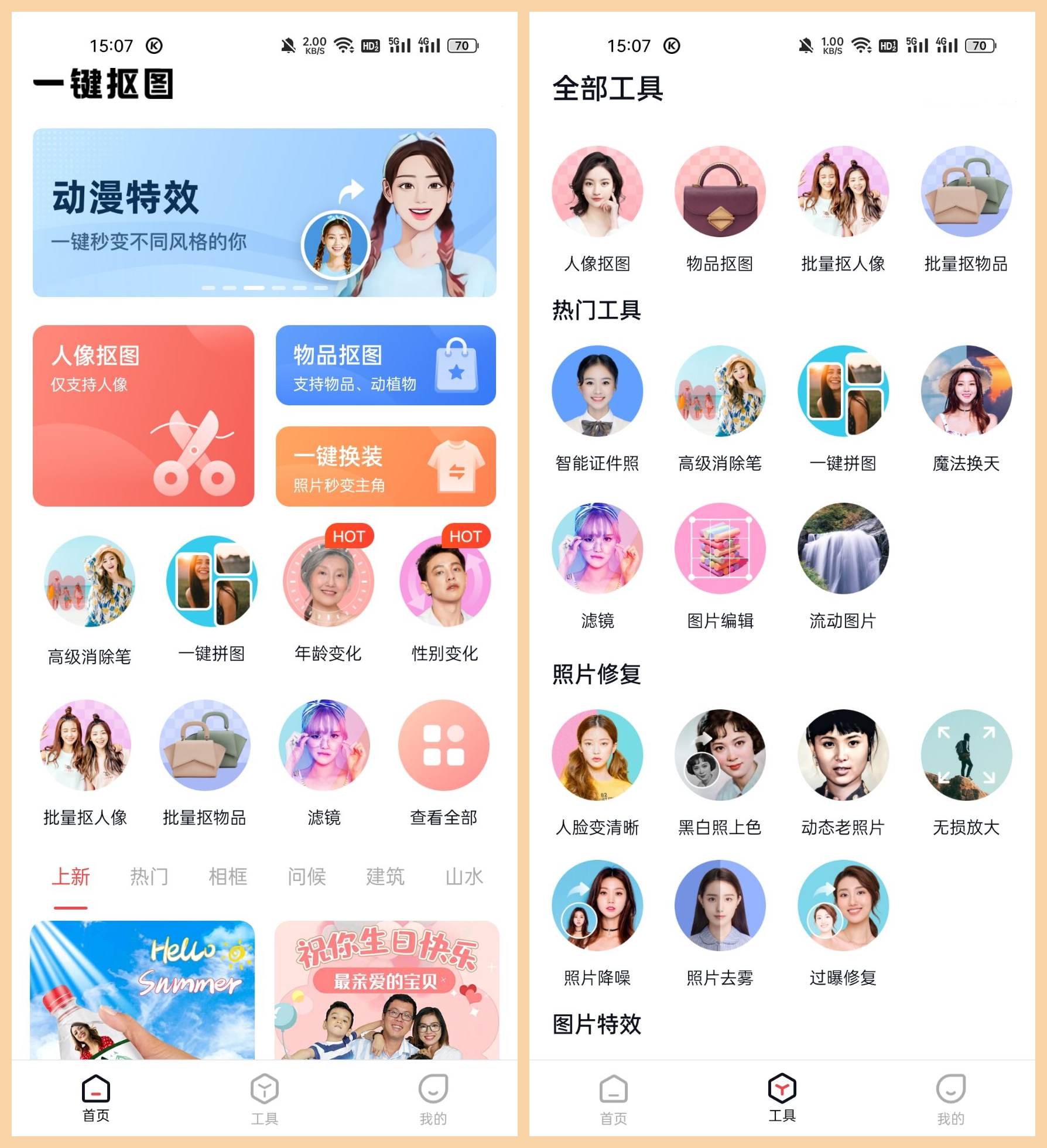 首先,我们打开手机上的【一键抠图】工具,接下来就会看到首页主要功能展示。想要了解全部功能,点击下方“工具”按钮,就会看到有几十种修图工具清晰罗列。